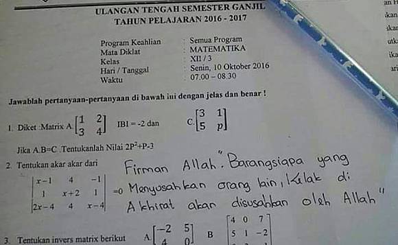 Nah, buat mereka yang susah sampe frustasi, biasanya sudah muncul keringat dingin kalau ujian datang. Maklum, mau cari contekan malah mikir belum tentu bener yang dicontek. Mau ngerjakan sendiri nggak tahu apa yang harus dijawab. Akhirnya, biar lembar jawaban nggak kosong, ada aja jawaban lucu yang muncul di lembar ujian. Yang begini ini ternyata nggak hanya sekali dua kali. Mungkin karena frustasi juga ya akhirnya bikin jawaban lucu tanpa sengaja.